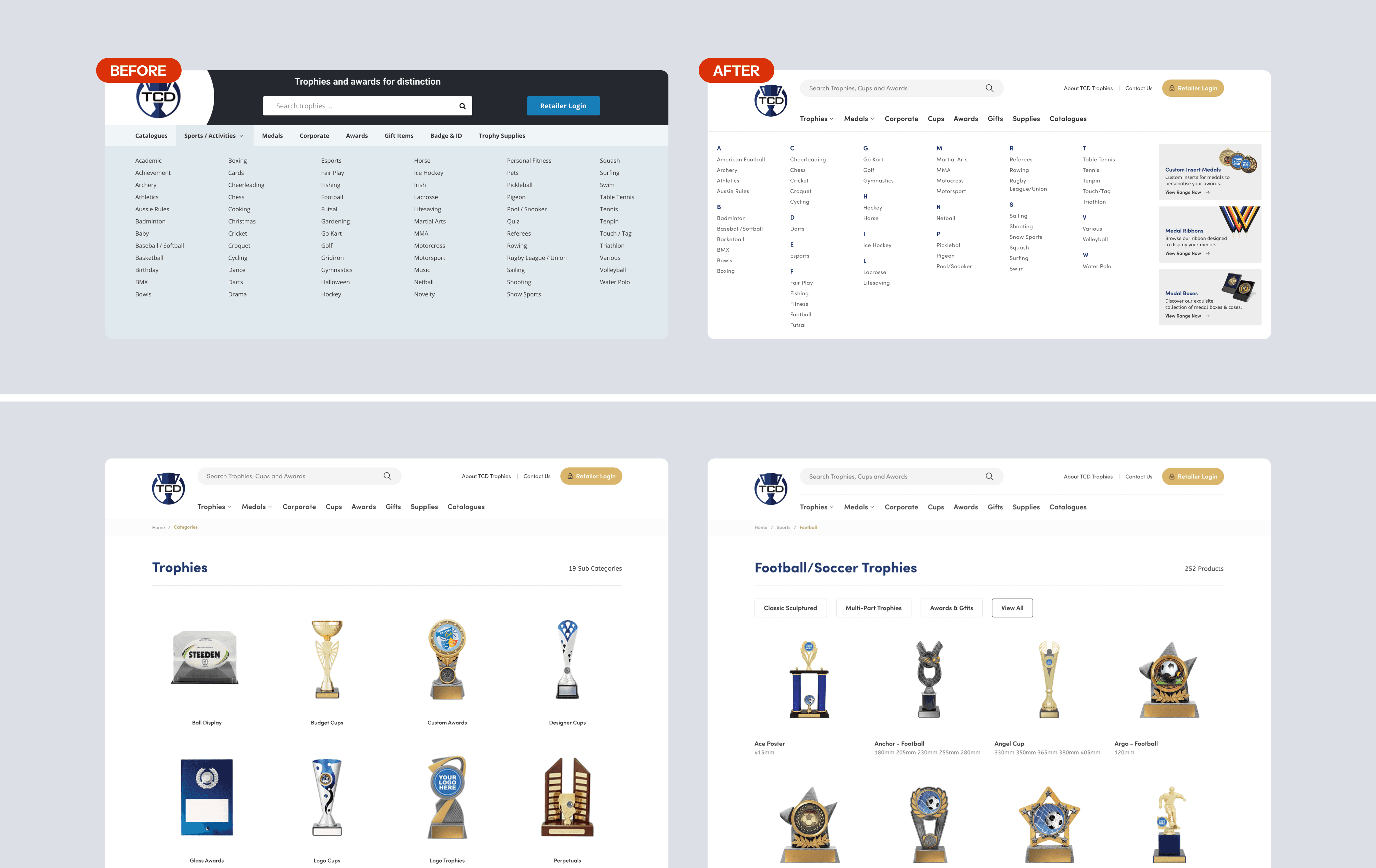 The original navigation exposed a large, unstructured list of categories, mixing sports, events, and unrelated groupings—making it difficult for users to quickly locate relevant products. The redesign introduces an alphabetized category system with consistent grouping and column structure, allowing users to scan and locate items more efficiently across a large inventory. This reduced time spent scanning long lists and improved entry into relevant product categories.