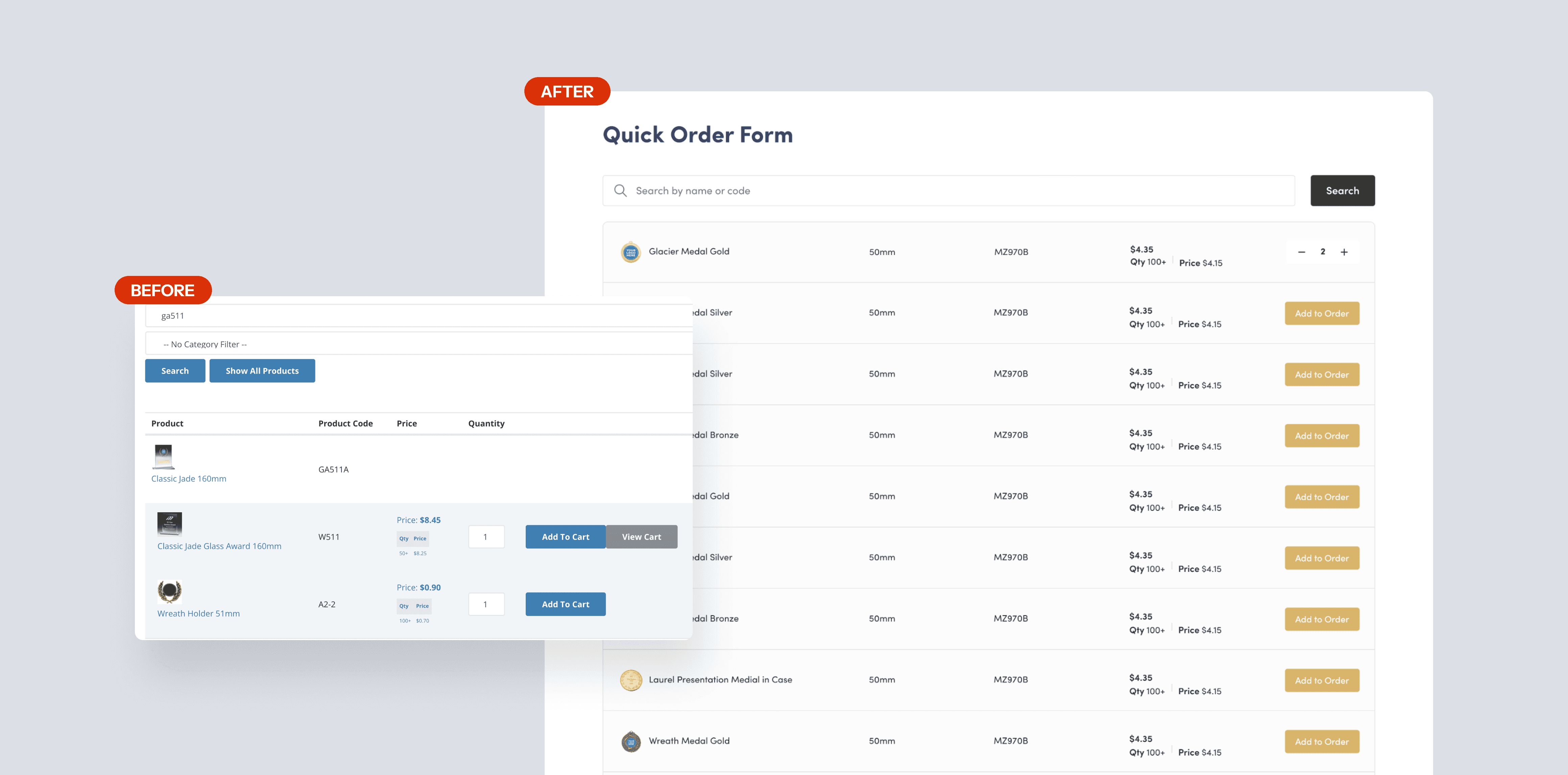 Many customers order trophies in large quantities for tournaments or events, where pricing and quantity relationships were not clearly visible. The redesigned interface introduces visible quantity controls and pricing tiers, allowing customers to understand how costs change as order size increases and reducing confusion during bulk purchases.