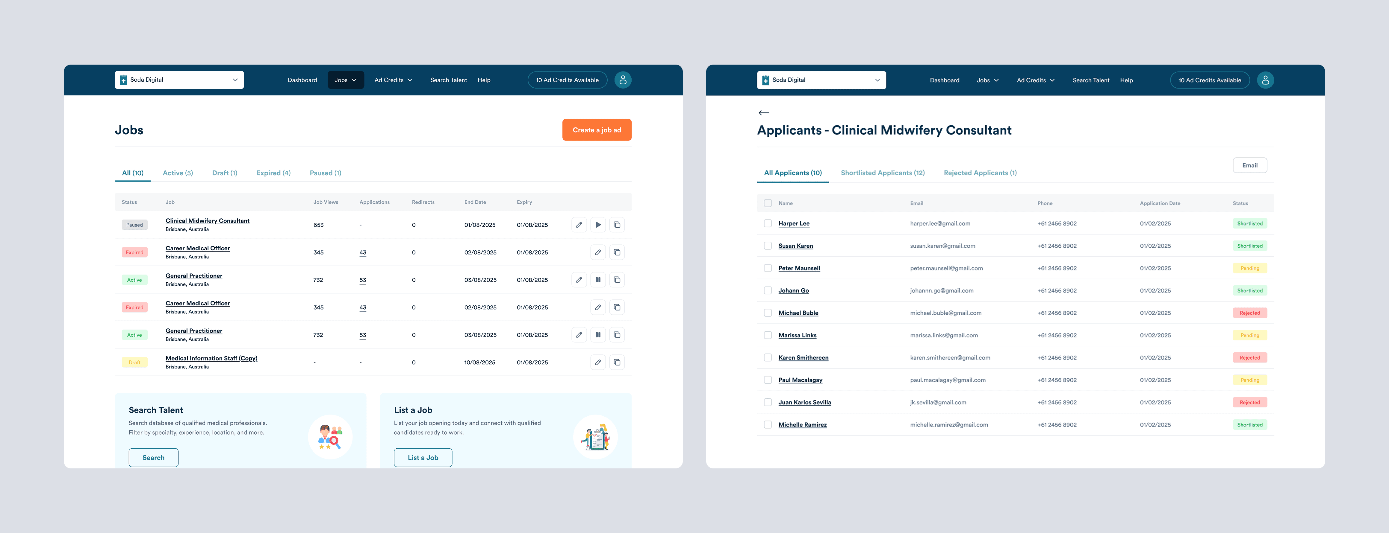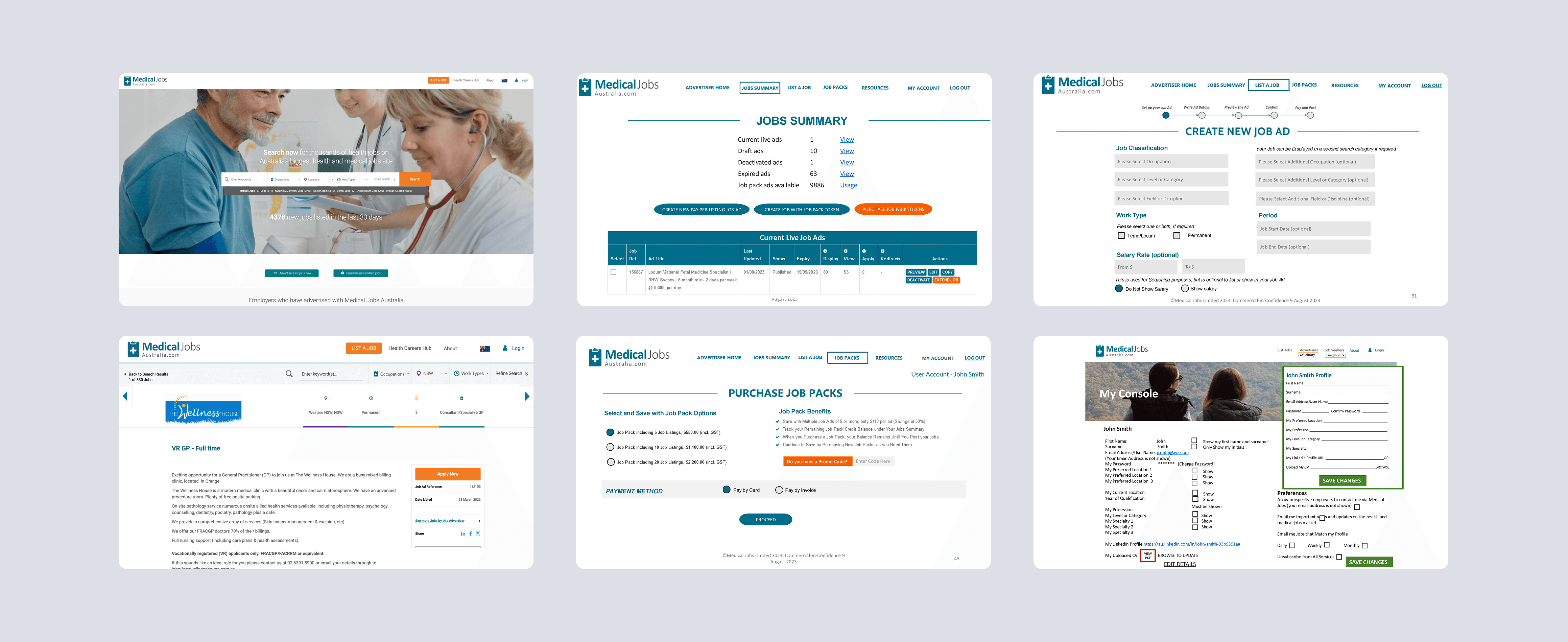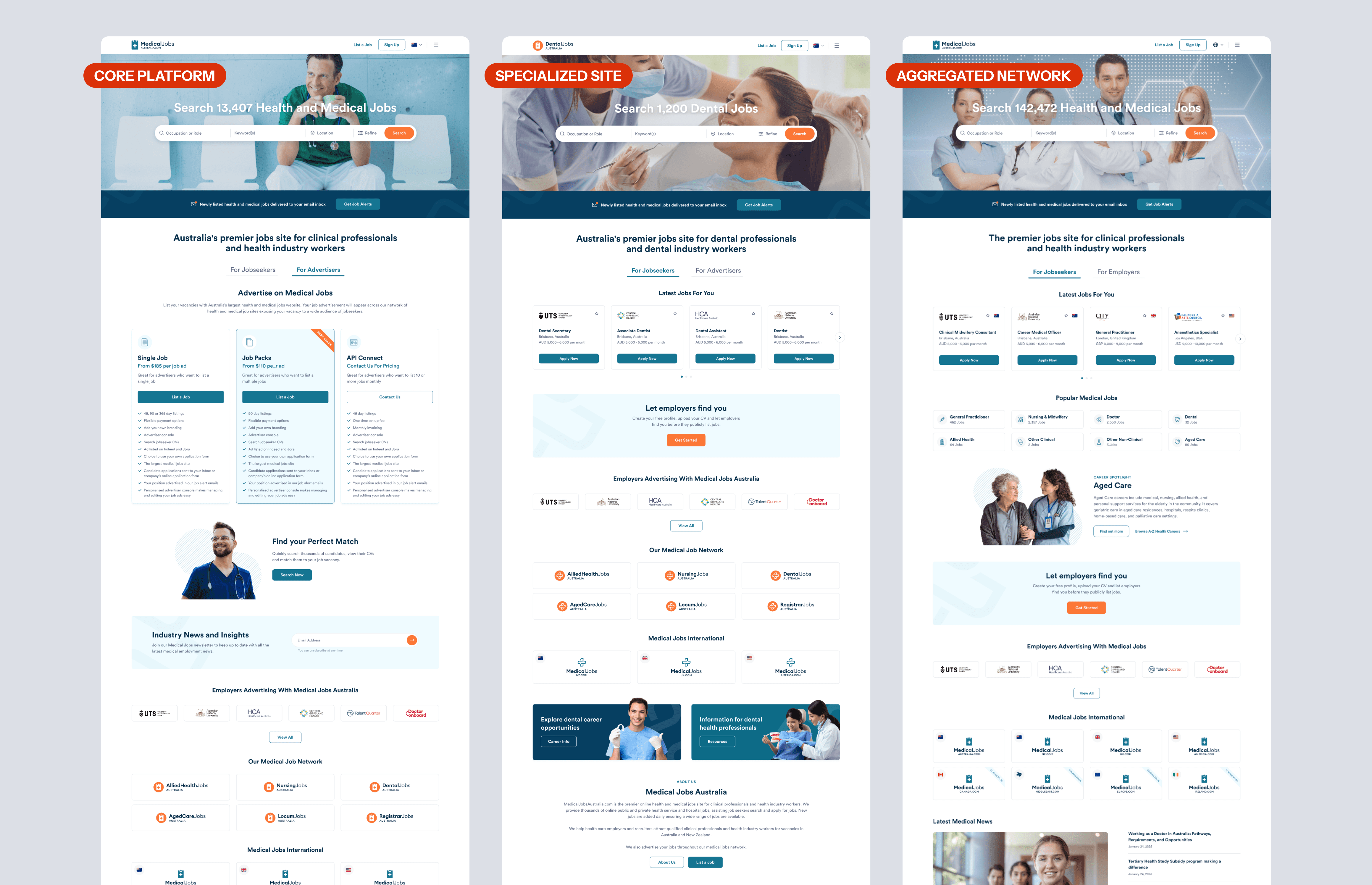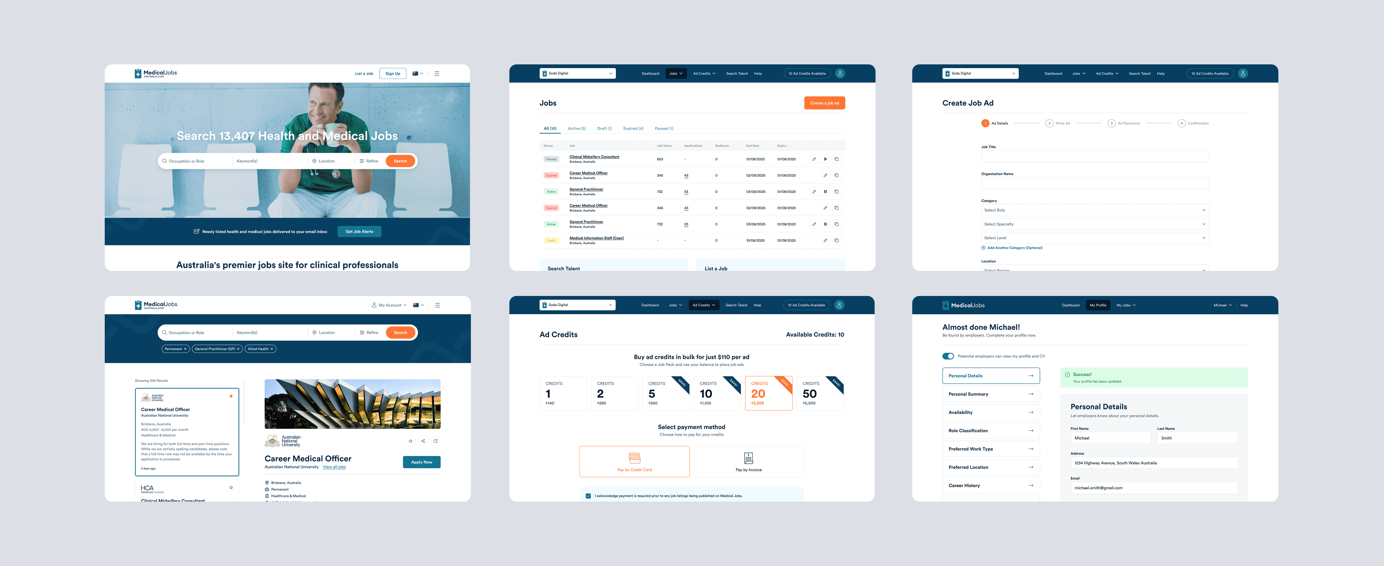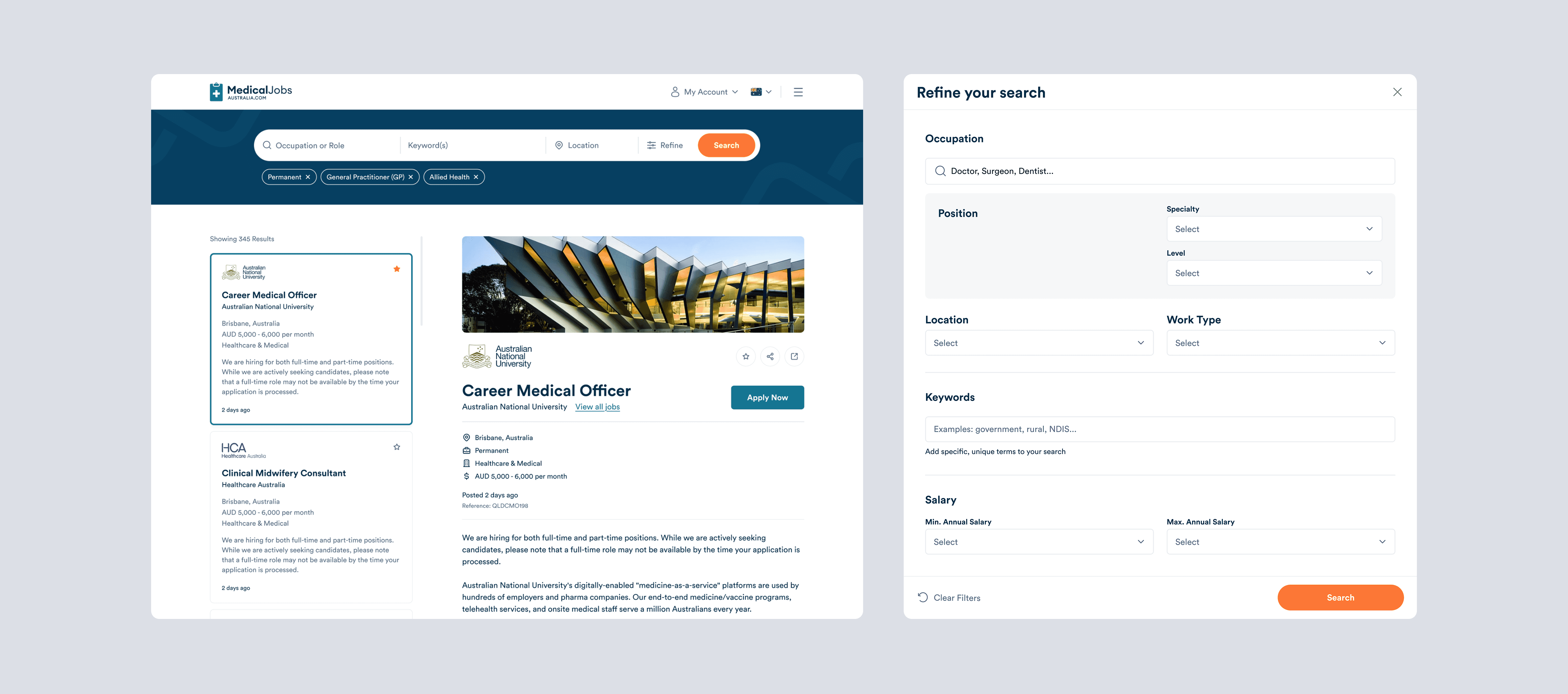 Medical Jobs Australia is a multi-site recruitment platform that connects healthcare organizations with medical professionals while supporting internal hiring workflows across different regions and facilities. Healthcare teams use the platform to manage job postings, track applicants, and monitor hiring activity, while candidates browse and apply to roles across multiple sites. The project focused on improving employer-side workflow visibility, streamlining job posting processes, and supporting scalable job distribution across a multi-site platform.