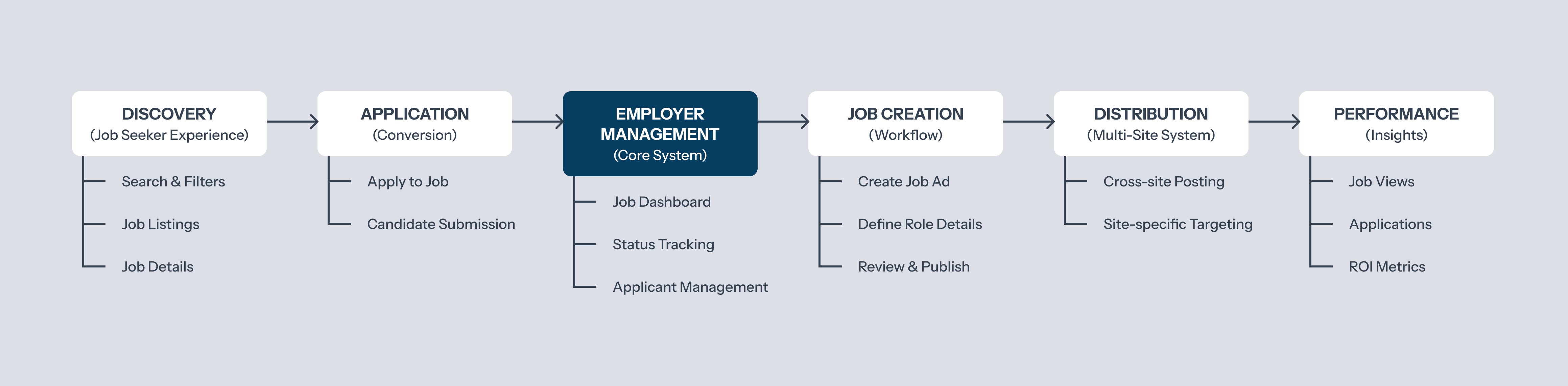 Job management, posting, and applicant tracking were distributed across separate sections of the platform, requiring employers to navigate between different pages to manage hiring tasks. This fragmented structure made it difficult to track job status, manage applicants efficiently, and understand overall hiring activity across multiple sites.