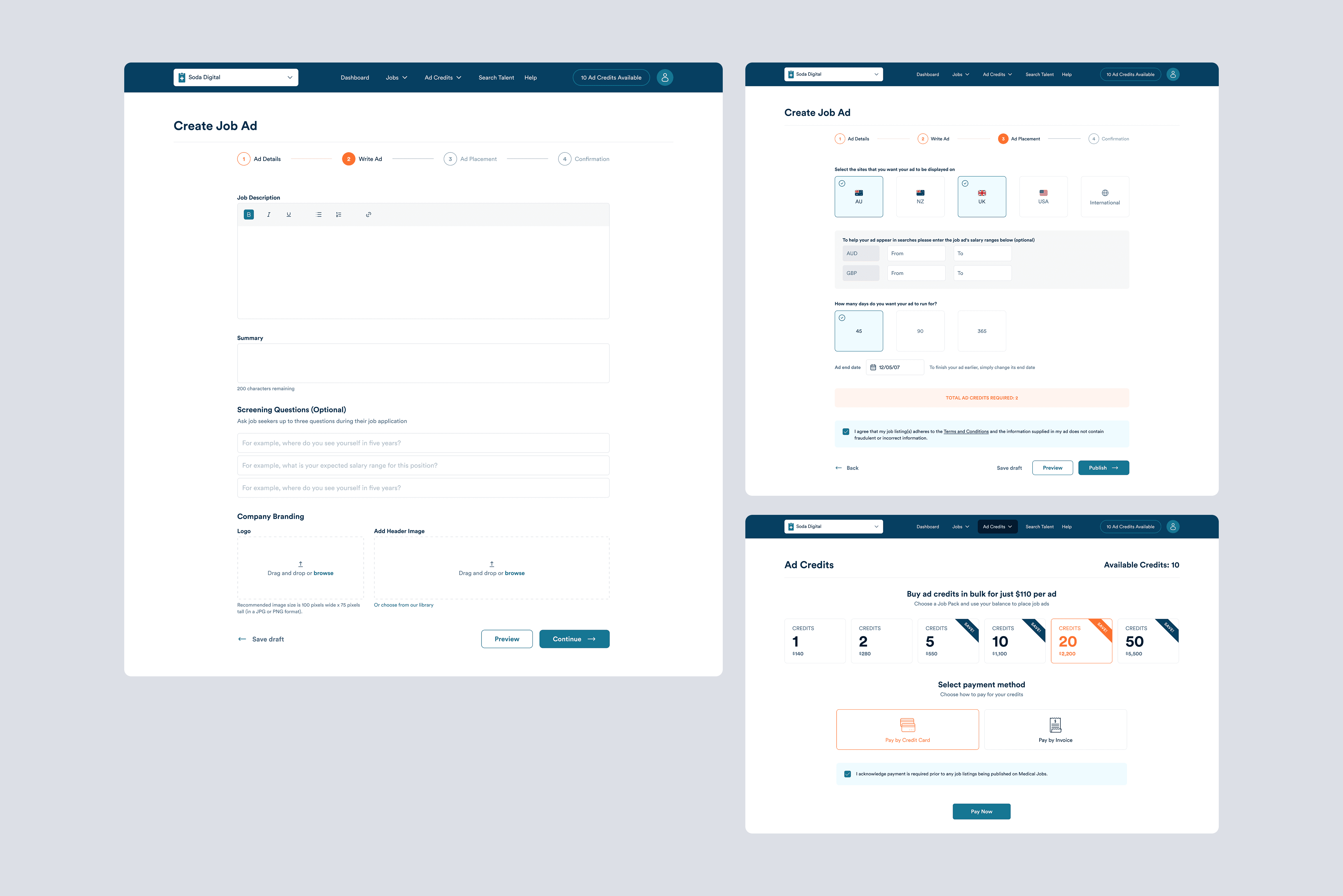 Creating a job listing involved multiple steps, including defining role details, publishing, and managing job credits. The redesigned workflow structures job creation into a clear, guided process, allowing employers to create and publish listings in one flow. Job posting is directly connected to a credit system, so employers can purchase and use job packs without leaving the workflow.